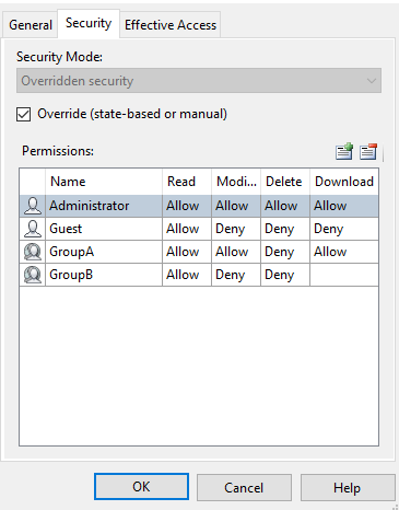 Effective Security At the bottom of the dialog, the Effective Security, which is the security currently in use by the object, is shown. In the example above, Override (state-based-or-manual) security is in effect.