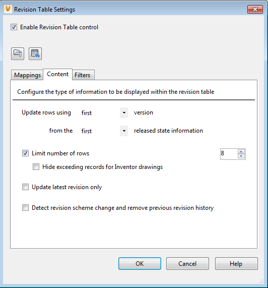 Content Tab | On the Content tab, you can enforce the type of information that is displayed in the revision table. ![]() |