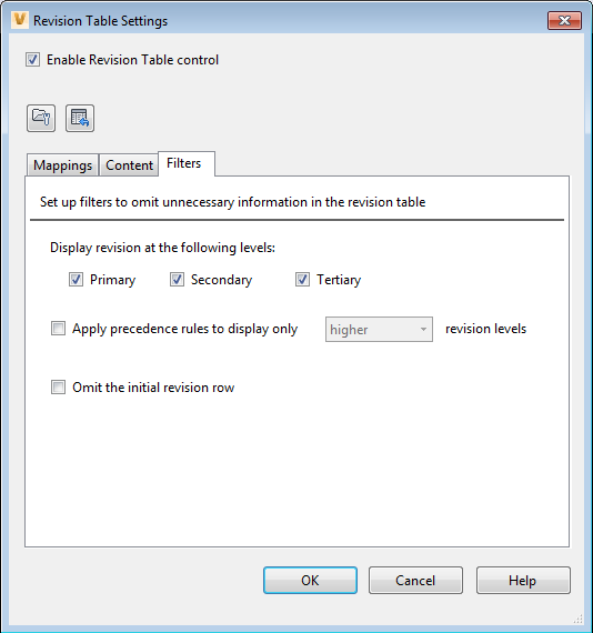 When multiple revision levels exist within a revision group, it is necessary to identify which level of revision that you want displayed. Enable the Apply precedence rules... check box and select whether you want the highest or lowest revision levels displayed in the revision table.