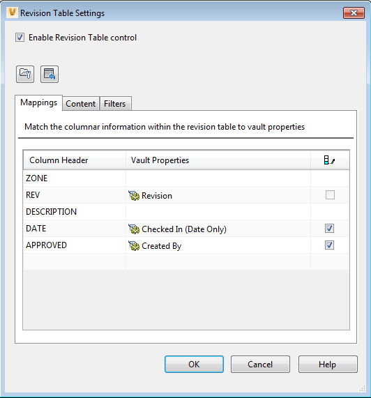 Mappings Tab | On the Mappings tab, you can map Vault Properties to the Revision Table columns. ![]() |