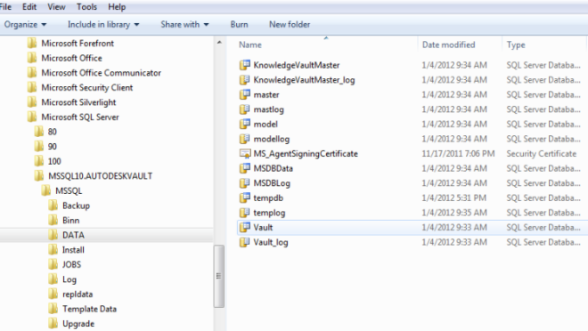 When you install the Autodesk Vault server, a single vault named Vault is created. The database files for the vault are created in the MSSQL$AUTODESKVAULT\Data folder under the Microsoft SQL Server installation folder.