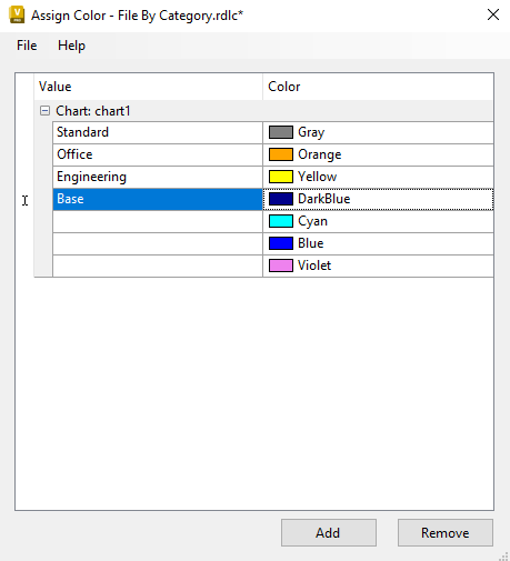 When a report is generated that returns a value for which a color has not yet been assigned, the report control will assign a color to the new value from a predetermined list of colors and write back the report template a name and value pair for the new color. The new value and default color assignment are displayed in the Assign Color dialog where the administrator can update the template by assigning a color to this new value.