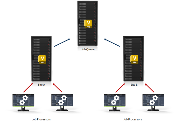 The Job Server supports multi-site environments by logging into a specific server and only processing jobs that are associated with that server. In the illustration below, any job processor that logs into Site B will only process jobs that are at Site B. The same happens for Job Processors in Site A.