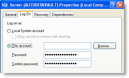 Double-click the SQL Server (autodeskvault) service, and select the Log On tab.