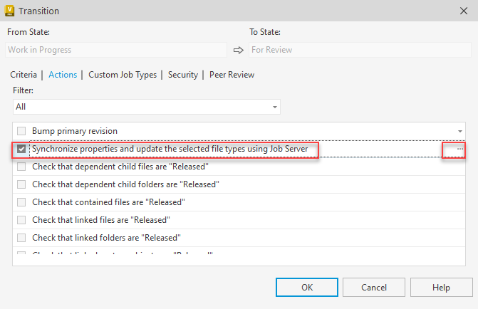 Select the check box for Synchronize properties and update the selected file types using Job Server from the Available Actions list.