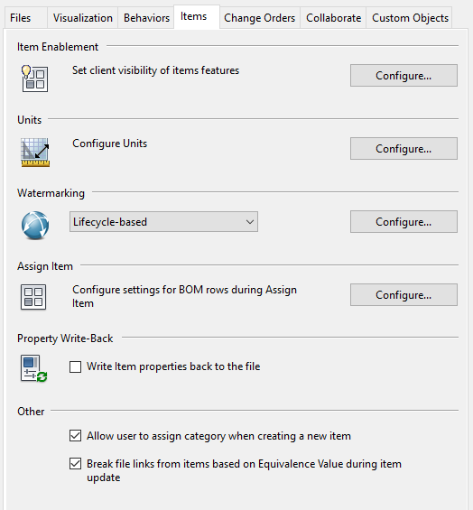 The Items tab on the Vault Settings dialog contains options for configuring units of measure, managing watermarking preferences, configuring settings for BOM rows, and enabling items to write back properties to associated files. You can also disable the items feature.