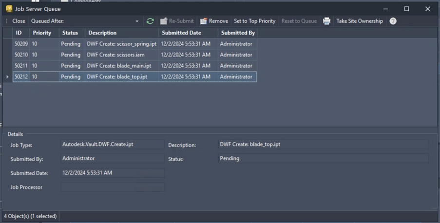 The Job Server Queue is a list, or queue, of jobs submitted by clients (Inventor, Auto, Vault, and Autoloader) waiting to be processed. This queue is stored in and managed by the Vault Server.