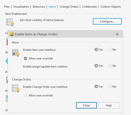 In the Item Enablement section, click Configure. The Enable Items and Change Orders dialog provides options for controlling Items access.