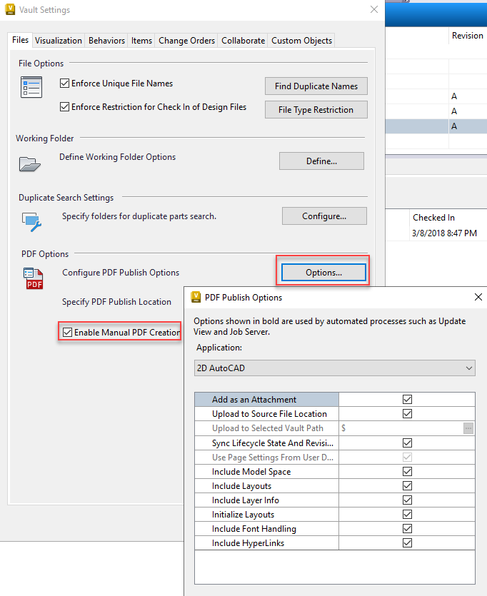 Check the Enable Manual PDF Creation box to be able to create a PDF without going through lifecycle state change for a drawing file. The Create PDF command is available in the toolbar, context menu, and the Actions menu.
