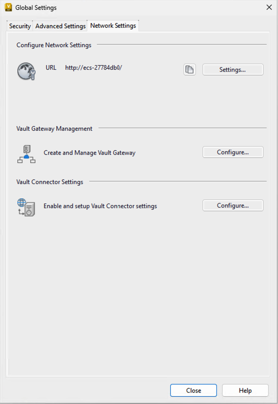The Network Settings tab displays a server URL used for connecting to the Vault Client.