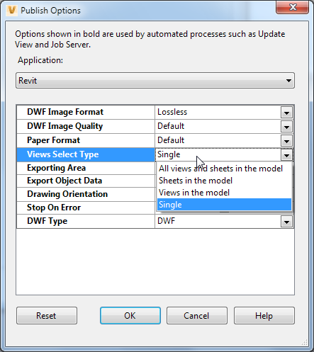 Views Select Type | Specify which view(s) you need to publish. - Single–publishes the last saved view/default view.