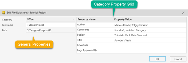 The grid of General Properties has static definitions, a label, and a content control bound to a Vault property, saved in the dialog definition file. The Dynamic Grid is an empty grid object that automatically adds labels and value fields through the selection of an entity (File, Folder, Custom Object) category. These two grids are the core elements in Create/Edit Datasheets (see the image before) and Datasheets in detail tabs: