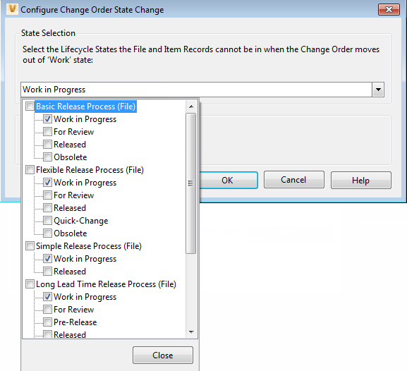 Click Configure next to Restrict Change Orders from moving out of 'Work' state based on File and Item Lifecycle states.