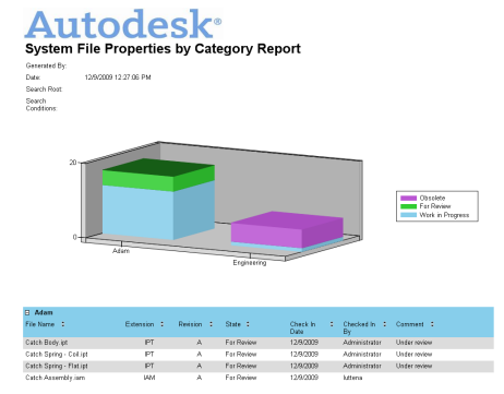 Report templates are provided with the Autodesk Vault client. These report templates contain a color palette for a chart, but the templates do not specify which color is assigned to which chart element. You can specify how chart elements are color coded when you use the data mapping feature. Color coding chart elements allows quick, repeatable viewing of model data.