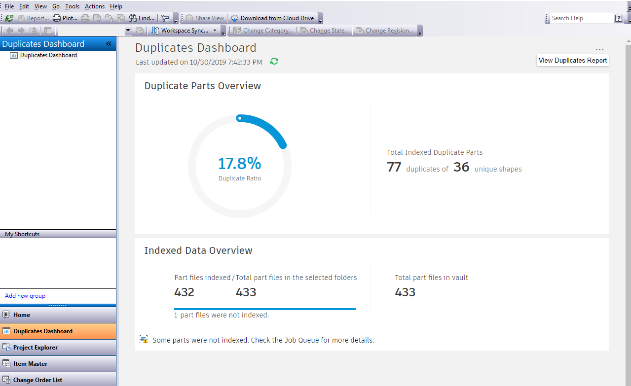 Use the dashboard to view the status of duplicate and indexed parts.