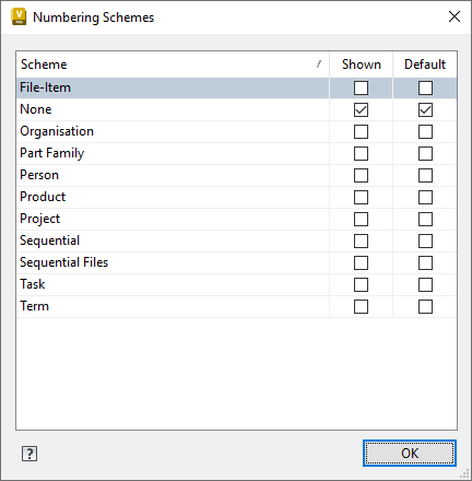 Select the Shown check box for any numbering scheme you want to display as a view button in the Numbering Schemes Panel.