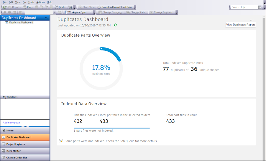 After the files are indexed, you can view the data in the Duplicates Dashboard. In Vault Client, click Duplicates Dashboard. You can view the duplicate parts report which can also be exported to Excel, PDF or Word format.