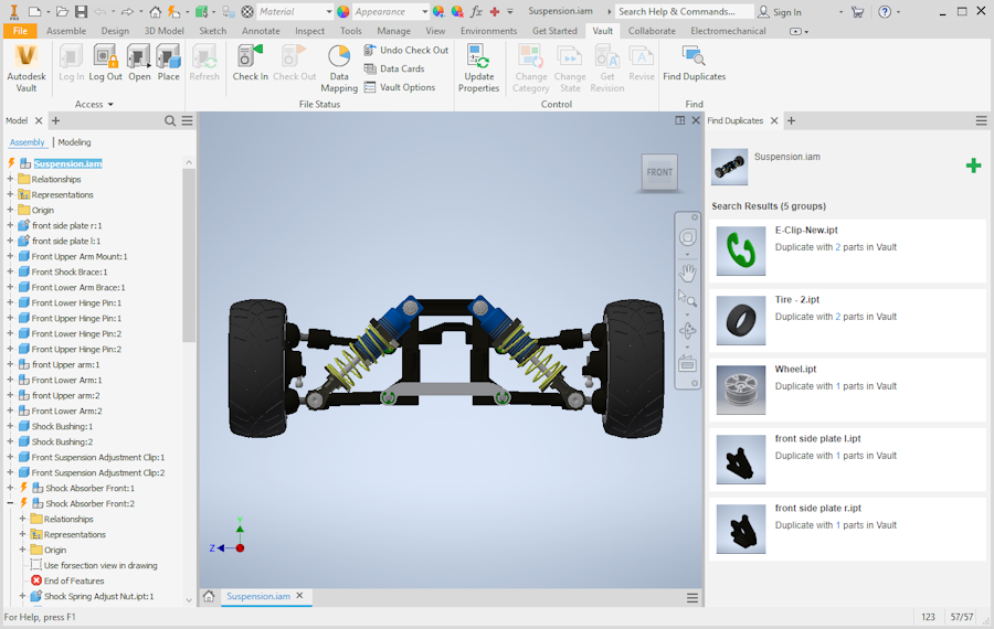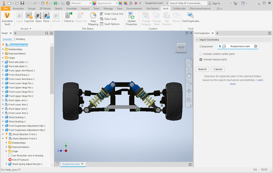 Duplicates of the parts files inside the assembly displays in the Find Duplicates panel. When you search within an assembly, duplicate groups are displayed first. Click the group to review the duplicate part files from Vault.