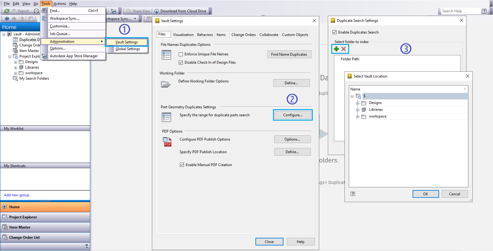 In the Vault Settings dialog box, define the search range. Specify folders where parts will be indexed.