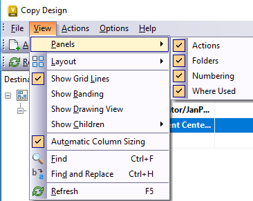 Folders | The Folders Panel lets you review the source and destination folders for the copy design operation. This is a great way to verify that the necessary files are selected and will be copied to the correct location. You can group selected files for operations based on the folder location. You can also drag-and-drop files between folders or from the main grid to perform a copy. See Folders Panel for more information. |