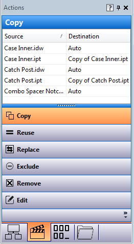 Actions | The Actions Panel lets you review which operations are assigned to be performed on files in the main view. Once you have configured the files in the main view, you can use the Actions Panel to filter the files based on their assigned operation. Assigned operations include copied, reused, replaced, excluded, removed, or edited. Note: You can also set action operations by dragging and dropping files from the main grid onto the desired operation button in the Actions Panel. See Actions Panel for more information. |
