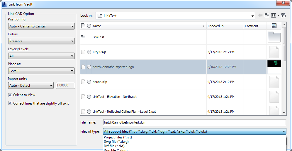 You can select a file in Vault to be linked to the current Revit project and specify position options for the linked file on the Link from Vault dialog.