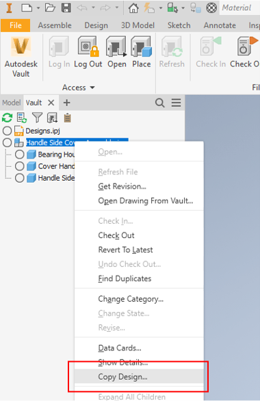 In Inventor, right click a file in the Vault browser and click Copy Design.