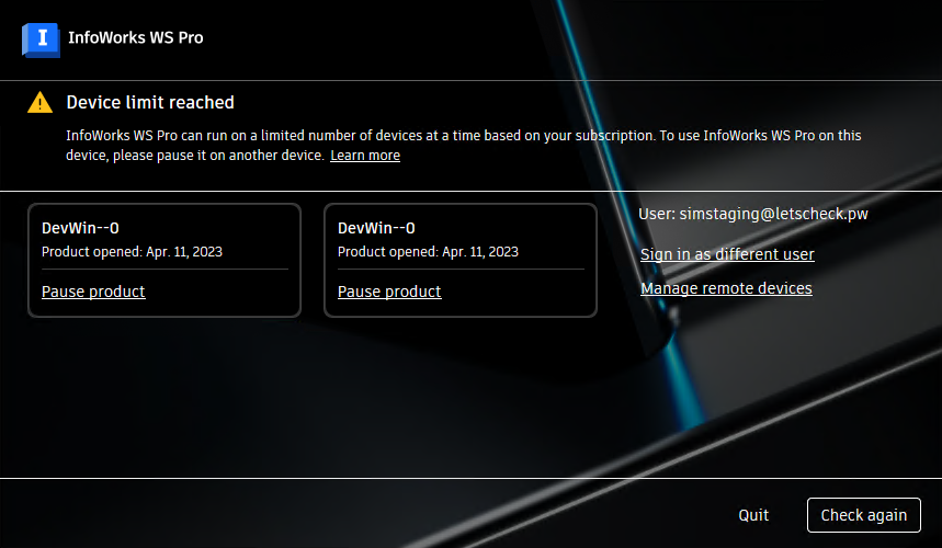 Based on your subscription, InfoWorks WS Pro licenses may only be used on limited number of devices at any one time. When this limit is reached and you try to use the application on another device, a Device Limit Reached dialog is displayed. It lists the devices the application is currently being used on and lets you pause the usage on a selected device so that you can use the license to access the application on the current device. An example is shown below.