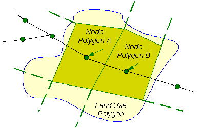 Node Polygons are used to calculate the proportion of demand from a Land Use area to be assigned to a node. To avoid duplication of demand, node polygons should not overlap. The associated node does not necessarily have to be physically located within the polygon. A single node may have any number of associated node polygons.