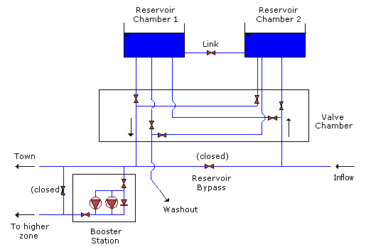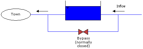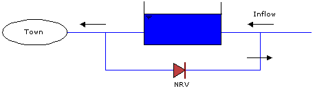 Reservoirs in distribution networks more often than not have a bypass pipe, connecting inflow and outflow pipes. This pipe is closed in normal conditions by a valve or a NRV (see figure below), but in emergencies it may be used to provide water even when the reservoir is out of use.