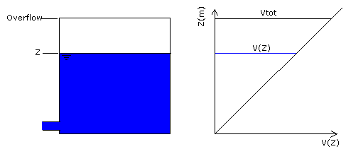 The important features of all of facilties is that the head (water level, Z) in such a node is known at one moment in time (thus allowing computation of inflow/outflow). It will remain constant during one steady-state computation, but will be changed in the next time-step (Δt) according to the continuity equation: