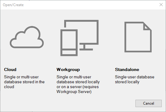 This dialog is used to select which type of database you want to open, create, update, or get the identifier for.