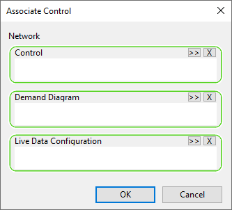 This dialog is used to associate a control, demand diagram, and live data configuration with a network.