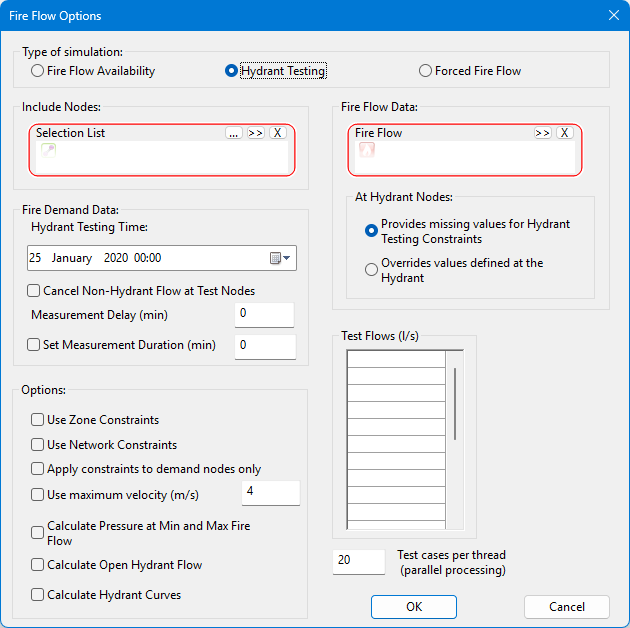 This dialog view lets you set up a hydrant testing simulation to test a selection of nodes in turn against a number of fire flow test parameters. A