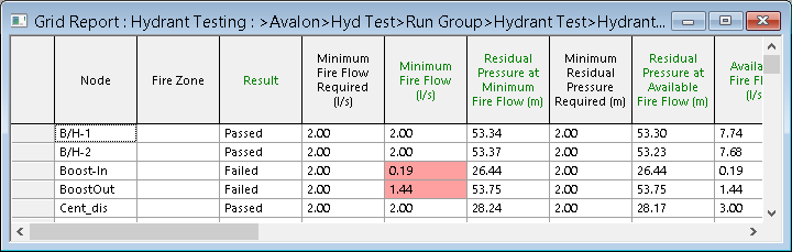 If the pressure constraints applied cannot be met, the test node will be Failed. Maximum Fire Flow Required: A maximum flow value is specified by the user in the Fire Flow Data Item or on the Hydrant Property Sheet of a Hydrant node. This information is displayed only if the Calculate Pressure at Min and Max Fire Flow option is checked on the Fire Flow Options dialog. Maximum Fire Flow: The smaller of the user defined Maximum Fire Flow Required and calculated Fully-open Hydrant Flow at the test node. This result is calculated only if the Calculate Pressure at Minimum and Maximum Fire Flow option is checked on the Fire Flow Options dialog. Residual Pressure at Maximum Fire Flow: Pressure at the test node when the Maximum Fire Flow is applied at the node. This result is calculated only if the Calculate Pressure at Min and Max Fire Flow option is checked on the Fire Flow Options dialog. Residual Pressure at Fully-open Hydrant: Pressure at the test node when the Fully-open Hydrant Flow is applied at the node. This result is calculated only if the Calculate Open Hydrant Flow option is checked on the Fire Flow Options dialog. Fully-open Hydrant Flow: Flow at test node when hydrant is 100% open. This result is calculated only if the Calculate Open Hydrant Flow option is checked on the Fire Flow Options dialog. Pre-Test Pressure: Pressure at test node at Hydrant Testing Time before applying fire flow. This is the result that would be obtained when carrying out a simulation of Run Type normal. Pre-Test Demand: Demand at test node at Hydrant Testing Time before applying fire flow. This is the demand that would be applied when carrying out a simulation of Run Type normal. Zone Minimum Residual Pressure Required: The minimum allowed residual pressure during the fire incident at nodes that are in the same Fire Zone as the test node. The test node itself is not included. This information is displayed only if the Use Zone Constraints option is checked on the Fire Flow Options dialog. Zone Minimum Residual Pressure: The minimum residual pressure during the fire incident at nodes that are in the same Fire Zone as the test node (the test node itself is not included). This result is calculated only if the Use Zone Constraints option is checked on the Fire Flow Options dialog. Minimum Zone Node: Node at which Zone Minimum Residual Pressure occurs. Network Minimum Residual Pressure required: The minimum residual pressure during the fire incident at nodes that are not in the same Fire Zone as the test node. This information is displayed only if the Use Network Constraints option is checked on the Fire Flow Options dialog. Network Minimum Residual Pressure: The minimum residual pressure during the fire incident at nodes that are not in the same Fire Zone as the test node. Note: Fixed Head,