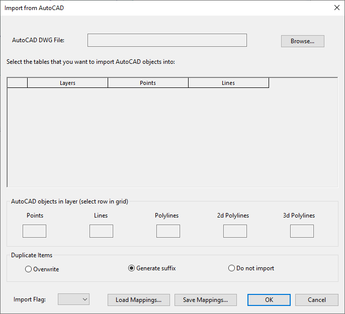 The Import from AutoCAD dialog is used when Importing from AutoCAD DWG files.