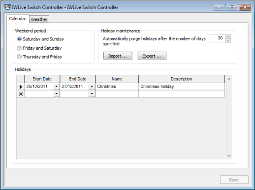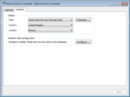 The IWLive Switch Controller dialog is used to set up links to weather feeds and to customise calendar information. The information is used to determine selection of Switch Object database items to be used in IWLive Pro Operator Client projection simulations.