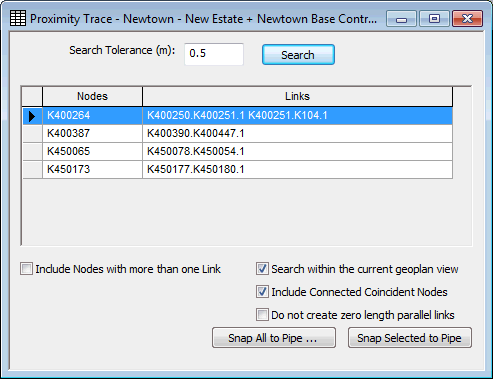 - Use the Search button to look for nodes that fall within the Search Tolerance distance of another pipe (by default, only disconnected nodes, or nodes with a single pipe connected are included in the search).