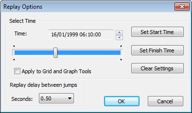 Clear Settings: Removes any changes you have made to the time selection and sets the replay start and finish time back to the start and finish time of the simulation.