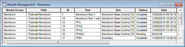 The view displays a grid view of simulations in the database or in a particular run group or model group. The grid describes the simulations, and what results are currently stored. The grid can be used to re-run selected simulations, move results, remove unwanted results, or view further information. For more details on using the view, see Managing results.