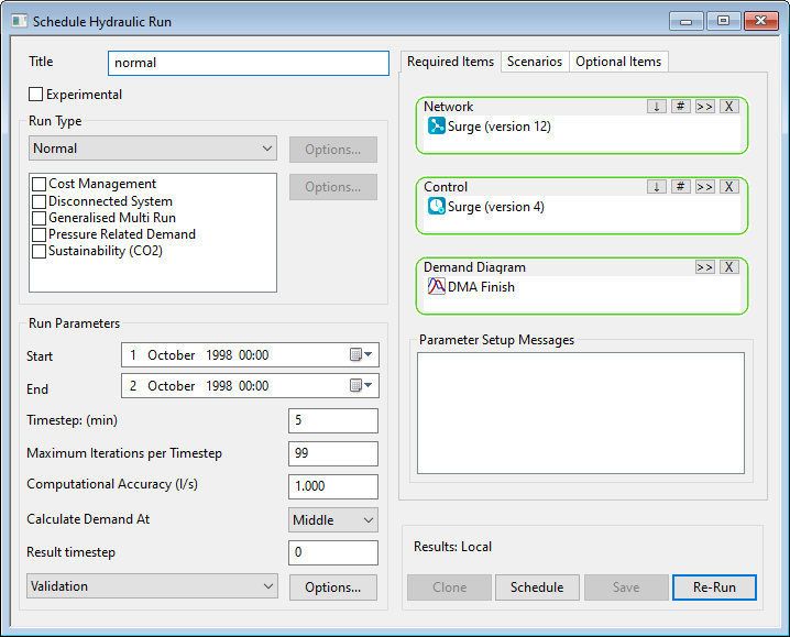 Once a simulation has been carried out with the box unchecked, configuration management is enforced. If any changes are made to parameters in the Schedule Hydraulic Run view, the results must be saved to a different file (that is, a new run title must be specified). You can use the facilities in