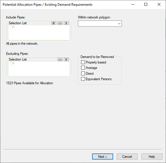 If the Selection list box is left empty, InfoWorks will assume that all pipes are available for allocation.