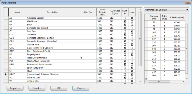 We strongly recommend that you create your own lookup tables, based on the pipe sizes, materials and manufacturers found in the water supply networks you manage. These user defined lookup tables will then become a company standard used for all your modelling. You can pass on these tables to consultants or other companies that carry out work for you by exporting them as CSV files.