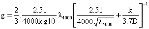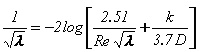 For Re >= 4000, InfoWorks solves the Colebrook-White equation iteratively to convert the specified internal roughness k to the Darcy-Weisbach friction coefficient to an accuracy of 0.1%: