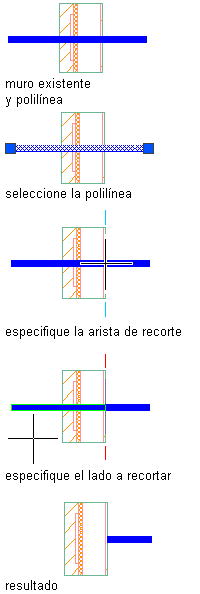 Utilice este procedimiento para recortar uno o más arcos, líneas, polilíneas, círculos, sombreados, polígonos AEC, extrusiones de elementos de masa o espacios de forma precisa a partir de un borde o lado seleccionado de cualquier segmento recto de una línea AEC. Con esta función, puede recortar fácilmente líneas de componentes de muros.