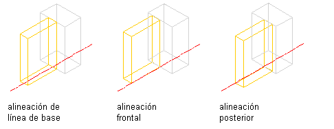 Utilice este procedimiento para alinear un relleno de forma que quede centrado con la línea base del conjunto de puerta y ventana, frente a ésta o detrás de ésta. En la vista en planta, la parte delantera de un conjunto de puerta y ventana (dibujada de izquierda a derecha) está debajo de la línea base y la parte trasera está encima.