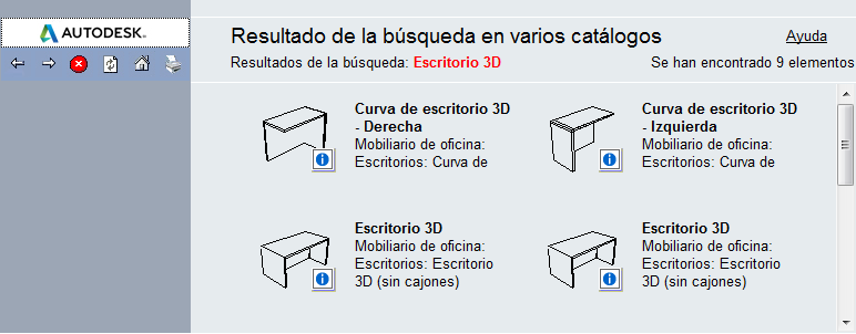 El resultado de la búsqueda aparece en el panel derecho de la ventana del Navegador de contenido. La siguiente ilustración muestra el resultado de buscar el término escritorio 3D en el grupo de catálogos de contenido: