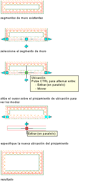 En la ilustración siguiente se muestra cómo utilizar el pinzamiento de ubicación en el modo Estirar (en paralelo) para mover un segmento de muro paralelo conectado y mantener las conexiones de muros adyacentes.