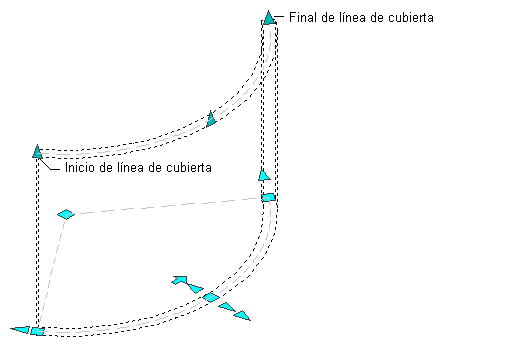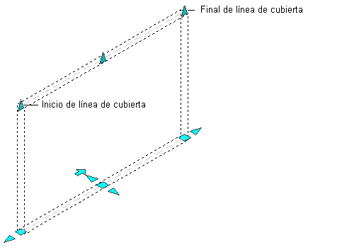 En la ilustración siguiente se muestran los pinzamientos de línea inicial y línea final de cubierta que aparecen para un segmento de muro recto en las vistas 2D y 3D.