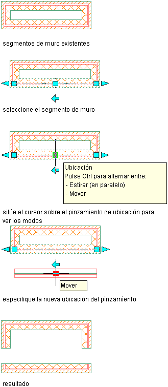 En la ilustración siguiente se muestra cómo utilizar el pinzamiento de ubicación en el modo Mover para mover un segmento de muro paralelo sin mantener las conexiones de muros adyacentes.